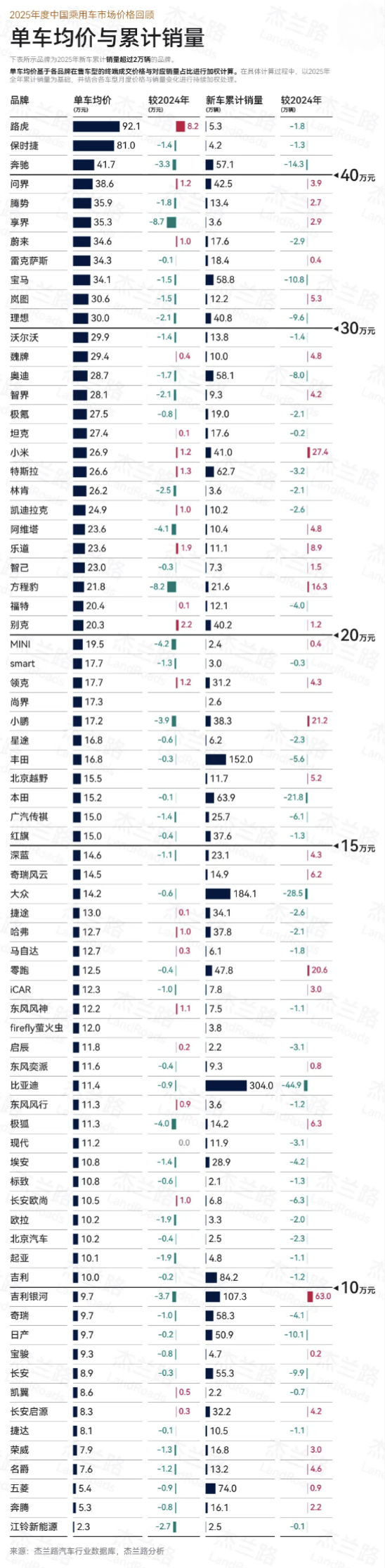 近日,杰兰路发布《2025年乘用车品牌单车成交均价与销售额报告》,报告显示,2025年问界单车成交均价达38.6万元,位列新势力品牌成交均价第一名;同时,全年累计销量超42万辆。成交均价与销量连续两年实现增长,形成“量价双升”昂扬曲线,反映出问界“智慧重塑豪华”的品牌理念与长期价值已获得市场广泛认可。