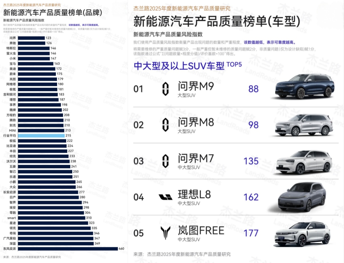 这份对质量的坚守,也获得了权威机构的认可,在杰兰路《2025年度新能源汽车产品质量研究报告》中,问界荣登新能源汽车产品质量榜单(品牌)第一,其旗下车型问界M9、问界M8、问界M7更在新能源汽车产品质量榜单(车型)中包揽中大型及以上SUV车型前三名。
